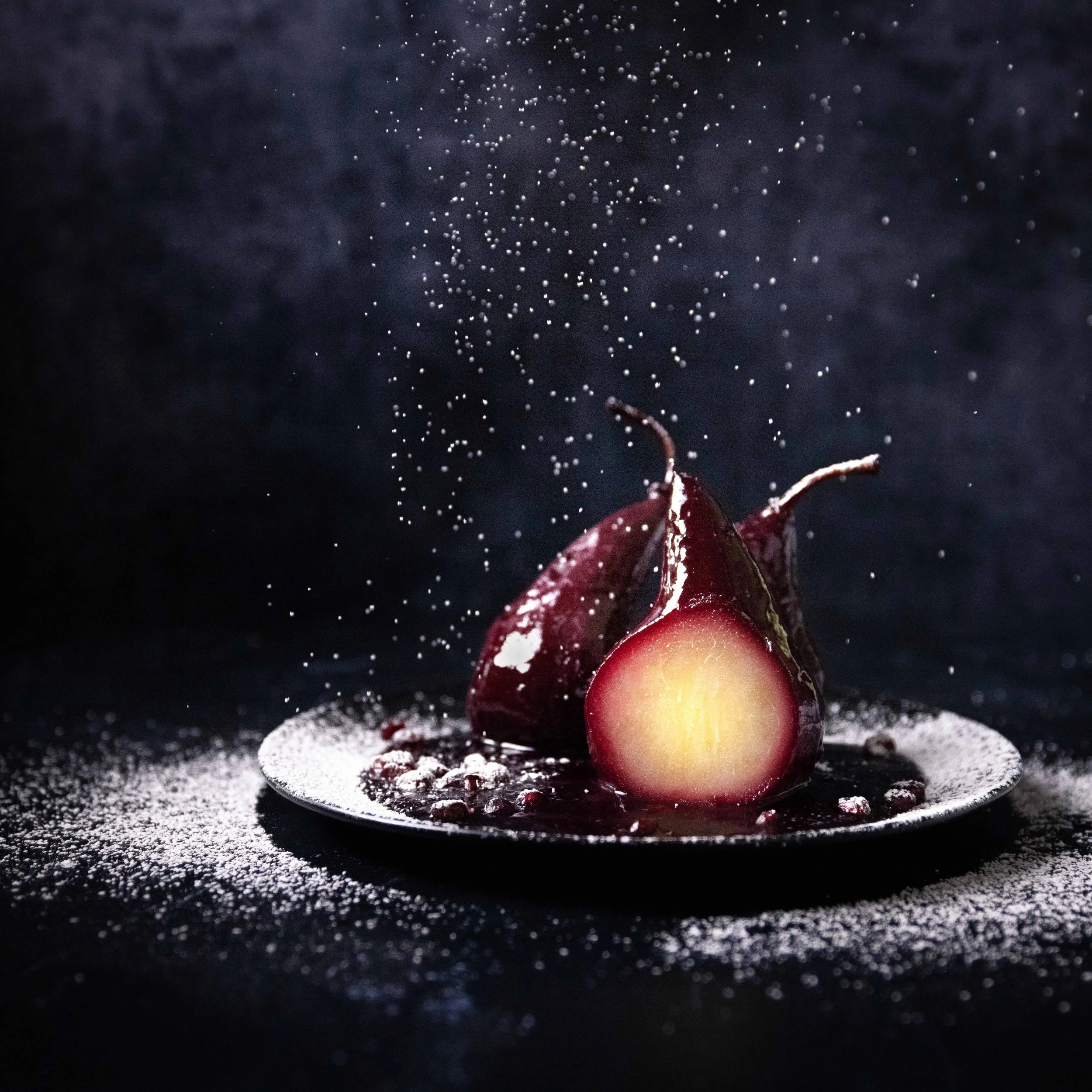 5. Spoon sauce over chilled pears. You may garnish with powdered sugar and pomegranate seeds. It is also delicious served with vanilla ice cream or mascarpone!